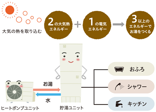 エコキュートはヒートポンプで大気の熱をくみ上げてお湯を沸かすシステムです。