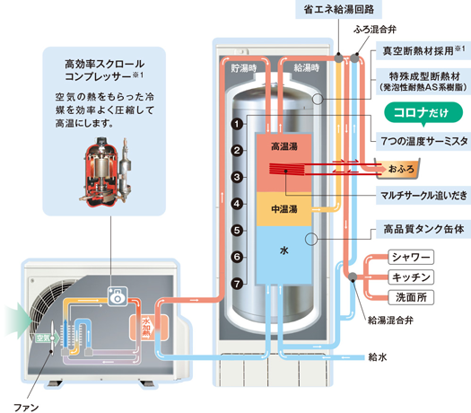 コロナのエコキュートは、ヒートポンプ技術を活用し、大気の熱を効率的に利用してお湯を沸かします。