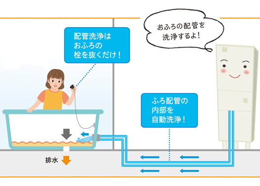 入浴後に浴槽の残り湯を利用し、配管内の汚れや雑菌を自動で洗い流す機能です。