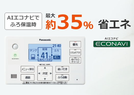 AI制御により最適な湯温管理を自動調整でき、無駄な加熱を抑えることで最大約35%の省エネを実現。