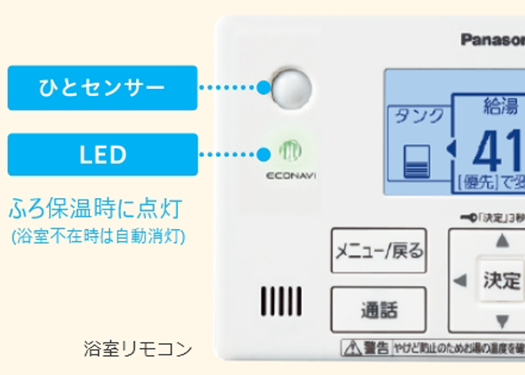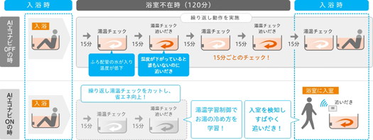 ひとセンサーで入浴を検知し、必要な時だけ追い焚きを実施。さらに湯温学習制御が浴槽の冷め方を学習し、無駄な湯温チェックを削減。