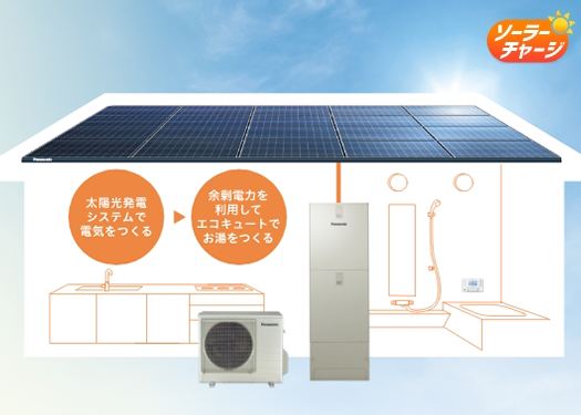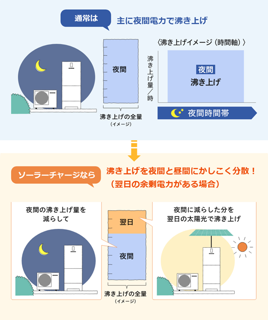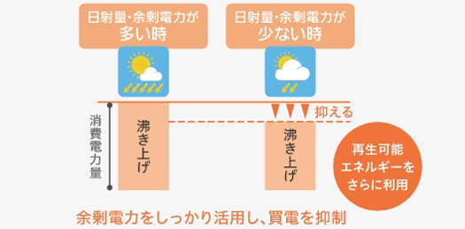 太陽光発電の余剰電力を自家消費してお湯を沸かす機能です。夜間の沸き上げ量を減らして、翌日の昼間に分散して沸き上げます。