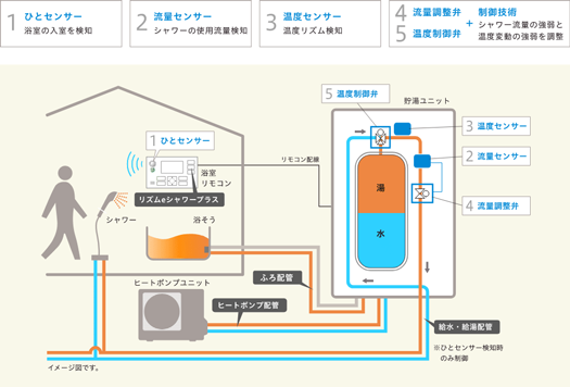 ひとセンサーと流量センサーがシャワーの使用を検知し、流量調整弁と制御技術でシャワー流量を高速で変動させます。