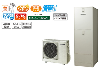 機能 : エコキュート専用アプリ / 無線LAN搭載コミュニケーションリモコン(台所リモコン) / 電気料金プランかんたん設定 / ピークセーブ / ダブルピークカット / ピークシフト設定 / ソーラーチャージ / AIエコナビ / うっかりアシスト / 配管洗浄 / キレイキープコート / 真空断熱材 / 4本脚 耐震設計技術 / ECHONET Lite AIF認証対応 / AiSEG2対応 / 昼間沸き上げ停止 / 給湯ガイド / 自動お湯はり / 自動保温・自動たし湯 / 追いだき / たし湯・高温たし湯 / 入室サイン